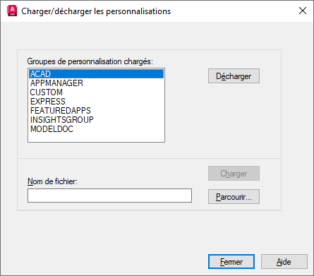 Boîte de dialogue Charger/Décharger les personnalisations