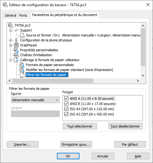 Ajuste la zone d'impression des formats de papier standard en fonction des possibilités de l'imprimante. (Vous ne pouvez pas créer des formats de papier personnalisés pour les imprimantes système Windows à l'aide de l'éditeur de configuration du traceur.)