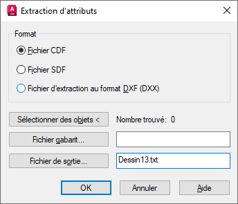 Spécifie le format de fichier des informations d'attribut, les objets à partir desquels vous voulez extraire des informations, ainsi que les noms du gabarit et du fichier de sortie.