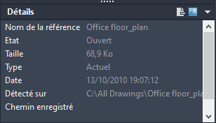 En mode Détails, les propriétés de la référence de fichier sélectionnée apparaissent. Chaque référence de fichier possède un jeu principal de propriétés et certaines références de fichier (images référencées, par exemple) affichent les propriétés en fonction du type de fichier. Ce jeu principal de détails inclut le nom de la référence, son état, la taille du fichier, le type de fichier, la date de création, le chemin enregistré, le chemin Détecté sur et la version du fichier. Il indique par ailleurs si le client Autodesk Vault (non disponible dans AutoCAD LT) est installé. Vous pouvez modifier certaines propriétés.