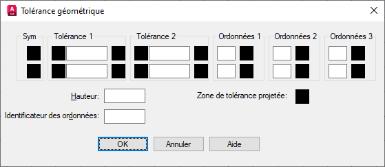Affiche le symbole géométrique caractéristique sélectionné dans la boîte de dialogue Symbole. Celle-ci s'affiche pour vous permettre de sélectionner l'une des boîtes de texte Sym.