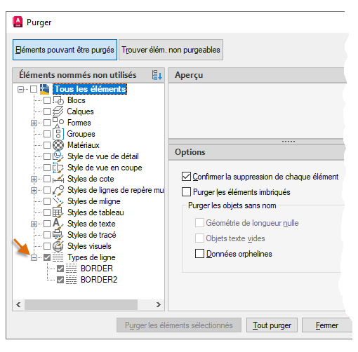 Pour purger certains types de ligne, développez l'arborescence Styles de lignes. Sélectionnez ensuite les définitions de types de ligne à purger.