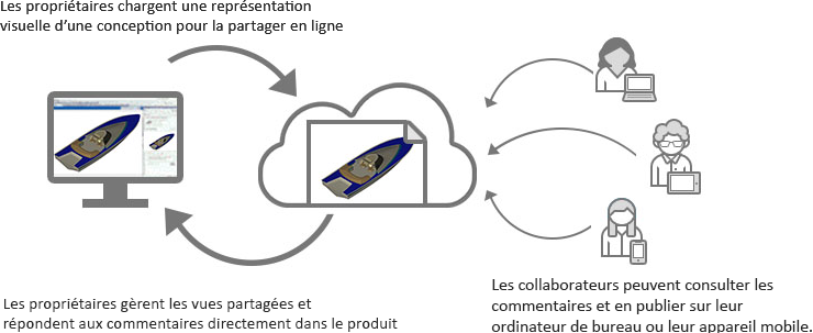 Elles permettent de collaborer sur une représentation visuelle de votre modèle ou de votre conception en ligne. Par exemple, créez une vue partagée pour un client afin que ce dernier approuve le modèle ou la conception, ou pour permettre à vos équipes commerciales d'y accéder facilement lors des présentations sur site. A l'aide du lien fourni, tous les utilisateurs peuvent afficher et commenter la vue partagée sans avoir à installer de produit Autodesk. Vous recevez un e-mail lorsque des commentaires sont ajoutés sur la vue partagée. Vous pouvez afficher et répondre aux commentaires, ainsi que gérer la vue partagée, directement dans votre produit Autodesk.