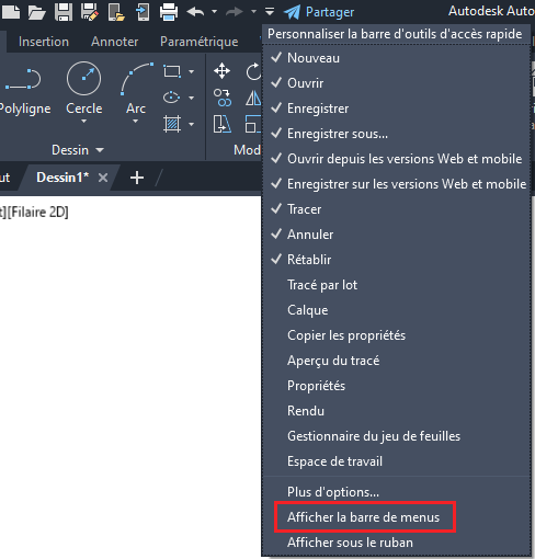 1. Pour afficher le menu, cliquez sur la liste déroulante de la barre d'outils d'accès rapide > Afficher la barre de menu
