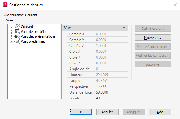 • Courant. Affiche la vue courante et ses propriétés Vue et Délimitation.