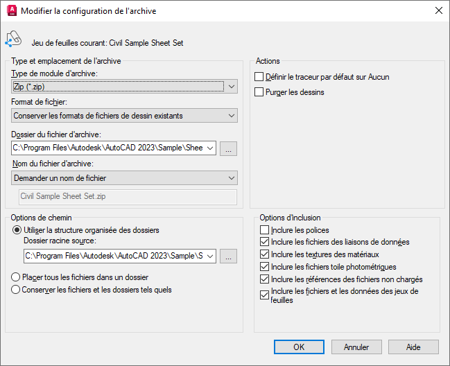 Inclut le fichier de données du jeu de feuilles (DST), les fichiers dessin de bloc d'étiquette, les fichiers dessin de bloc repère de vue et les fichiers gabarit de dessin (DWT) avec le module d'archive.