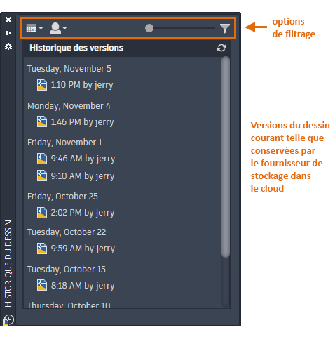 Affiche une palette à partir de laquelle vous pouvez répertorier et comparer les versions antérieures du dessin courant lorsqu’il est enregistré sur votre compte via un fournisseur de stockage dans le cloud pris en charge.