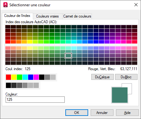 Vous pouvez choisir parmi les 255 couleurs de l'index des couleurs AutoCAD (ACI), les couleurs vraies et les couleurs du carnet de couleurs, disponibles dans les trois onglets.