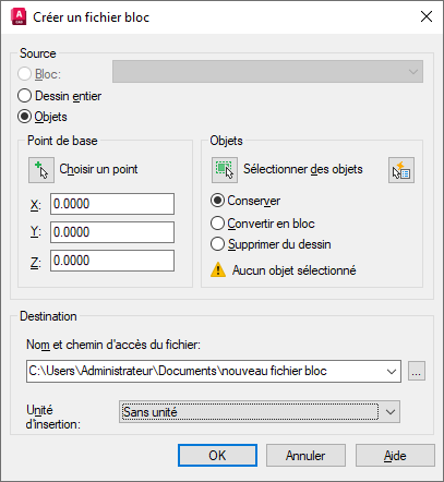 La boîte de dialogue Créer un fichier bloc offre une méthode pratique pour enregistrer une partie du dessin courant ou une définition de bloc spécifiée dans un fichier de dessin distinct.