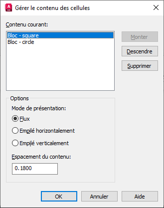 Lorsque vous insérez un bloc dans une cellule de tableau, soit le bloc peut s'adapter automatiquement à la taille de la cellule, soit la cellule peut être modifiée pour s'adapter à la taille du bloc. Les blocs peuvent être insérés à partir du menu contextuel. Vous pouvez insérer plusieurs blocs dans une cellule. Si une cellule contient plusieurs blocs, utilisez la boîte de dialogue Gérer le contenu des cellules pour personnaliser la façon dont son contenu s'affiche.