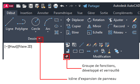 Vous pouvez extraire un groupe de fonctions d'un onglet du ruban et le placer dans la zone de dessin ou sur un autre écran. Le groupe de fonctions flottant reste ouvert jusqu'à ce que vous le replaciez sur le ruban, même si vous passez à un autre onglet du ruban.