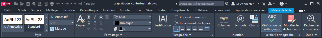 Lorsque vous sélectionnez un certain type d'objet ou exécutez des commandes spécifiques, un onglet de ruban contextuel s'affiche à la place d'une barre d'outils ou d'une boîte de dialogue. L'onglet contextuel se ferme lorsque vous terminez la commande.