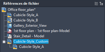 Le niveau supérieur de cet affichage indique le dessin courant. Les fichiers référencés apparaissent au niveau suivant. Vous pouvez ouvrir les fichiers référencés qui contiennent leur propre références de fichier imbriquées pour afficher d'autres niveaux. Lors de la sélection, vous ne pouvez pas sélectionner plus d'une référence de fichier à la fois.