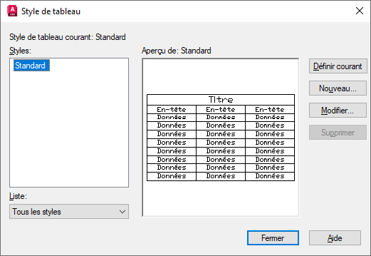 Supprime le style de tableau sélectionné dans la liste Styles. Vous ne pouvez pas supprimer le style en cours d'utilisation dans le dessin.