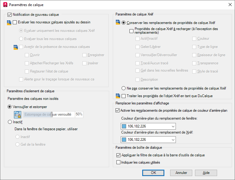 Contrôle l'affichage des propriétés d'objet sur les calques référencés (variable système XREFOVERRIDE). Les objets sont traités comme si leurs propriétés étaient définies sur DuCalque et chaque calque de référence externe peut disposer de ses propres remplacements de calque.