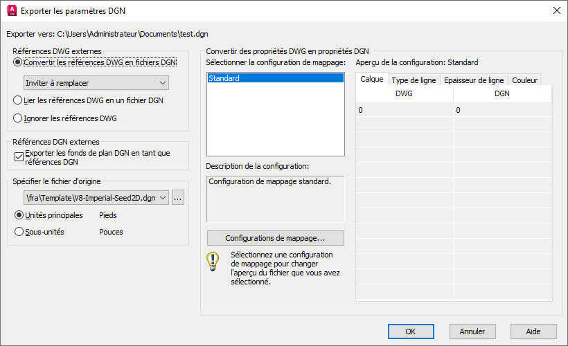 Standard est la configuration de mappage par défaut qui extrait des données du dessin exporté et applique un mappage automatique aux calques DGN, types de ligne, épaisseurs de ligne et couleurs, tels qu'ils apparaissent dans l'aperçu de mappage.