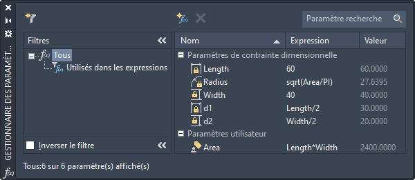 Les paramètres de contraintes dimensionnelles Longueur et Largeur sont définis sur des constantes. Les contraintes d1 et d2 sont des expressions simples qui référencent Longueur et Largeur. Le paramètre de contrainte dimensionnelle Rayon est défini sur une expression qui inclut la fonction racine carrée, des parenthèses pour déterminer la priorité des opérations, la variable utilisateur Aire, l'opérateur de division et la constante PI. Ces paramètres sont disponibles dans le gestionnaire des paramètres.