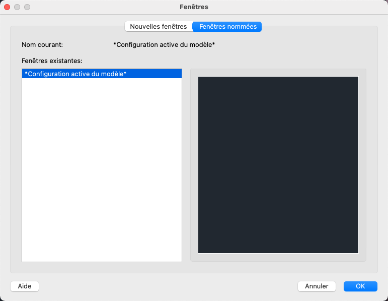 Dans la fenêtre sélectionnée, remplace la vue par celle choisie dans la liste. Vous pouvez choisir une vue existante ou, si vous avez activé la configuration 3D, la sélectionner dans la liste des vues standard. Utilisez la zone d'aperçu pour visualiser les choix.