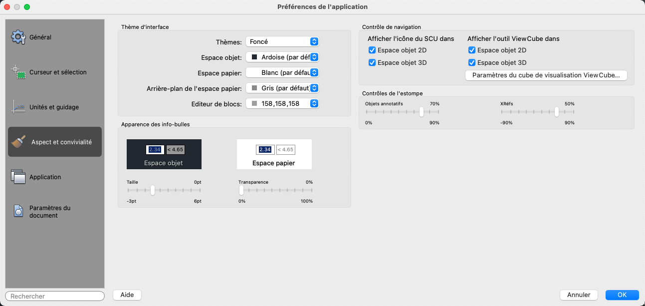 Contrôle le thème à appliquer aux éléments, tels que la barre d'état, les palettes et les fenêtres de dessin. Vous pouvez choisir entre un thème sombre ou clair.