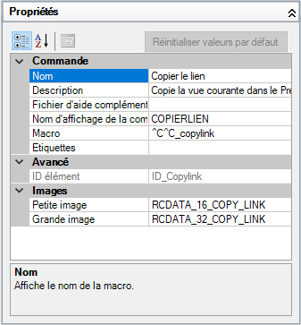 Le tilde (~) et le point d'exclamation suivis d'un point (!.) sont placés au début du libellé de la commande Copier le lien dans la propriété Nom du volet Propriétés. Ci-dessous, la commande Copier le lien apparaît maintenant marquée et en grisé dans le menu Edition.