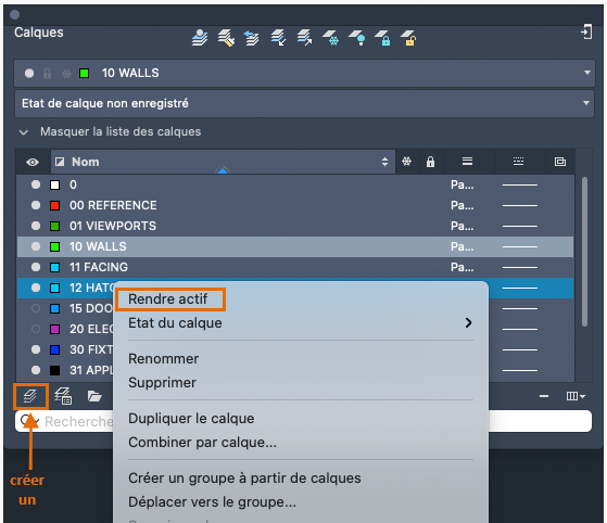 Pour créer un calque, cliquez sur le bouton affiché, puis entrez le nom du nouveau calque. Pour modifier le calque courant, double-cliquez sur son nom ou cliquez avec le bouton droit de la souris sur le nom du calque et choisissez Rendre actif.
