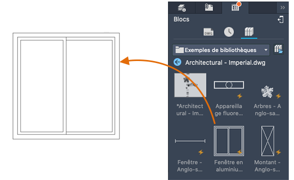 - Dans la palette de blocs, double-cliquez pour placer le bloc ou faites-le glisser pour le placer. Lorsque vous double-cliquez pour placer le bloc, vous pouvez utiliser les accrochages aux objets pour plus de précision.