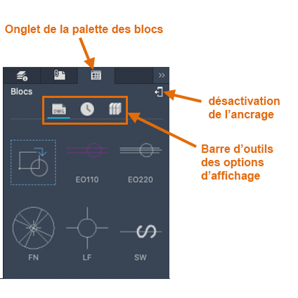Vous pouvez également accéder à un fichier de dessin et l'insérer en tant que bloc ou afficher les blocs sur le dessin dans la palette des blocs.