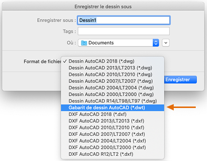 Vous pouvez enregistrer un fichier dessin (.dwg) en tant que fichier de gabarit de dessin (.dwt). Pour créer un fichier gabarit de dessin à partir d'un fichier existant, ouvrez le fichier gabarit de dessin existant, modifiez-le, puis enregistrez-le sous un autre nom de fichier.