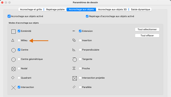 Pour activer ou désactiver le repérage par accrochage aux objets, appuyez sur la touche F11 ou sur