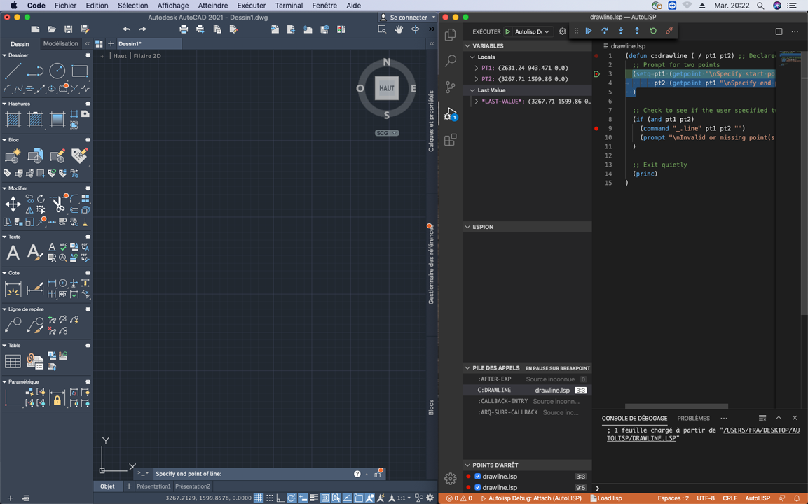 - Exécuter des instructions de code AutoLISP et des commandes AutoCAD dans la console de débogage