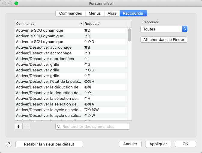 Cliquez sur le . Cliquez sur l'onglet Raccourcis. Les touches de raccourci par défaut s'affichent dans la boîte de dialogue. Cliquez sur