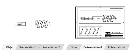 Dans un onglet de présentation, vous pouvez effectuer un panoramique ou un zoom de l'ensemble de la présentation de la même manière que dans l'onglet Objet. Pour ajuster la vue dans une fenêtre de présentation, vous pouvez accéder à l'espace objet en plaçant le curseur sur une fenêtre de présentation et en cliquant deux fois. La bordure de la fenêtre de présentation est mise en surbrillance ; vous pouvez alors effectuer un panoramique et un zoom sur la vue située dans la fenêtre de présentation. L'illustration de gauche montre une présentation avec le curseur placé dans l'espace papier. L'illustration de droite montre la même présentation, avec la fenêtre du haut comme fenêtre courante et un panoramique de la vue effectué en diagonale sur la droite.