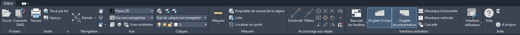 L'interface principale qui permet de gérer le fonctionnement de DWG TrueView est le ruban. L'onglet Début du ruban permet d'accéder aux options les plus courantes et d'effectuer les opérations les plus répandues.