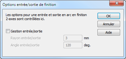 Ouvrez la boite de dialogue Options d'entrée/sortie de finition en cliquant sur le bouton Gestion entrée/sortie de l'onglet Approche/Accostage de la boite de dialogue des attributs d'usinage de fraisage, ou dans l'onglet Stratégie de la boite de dialogue des propriétés de la feature.
