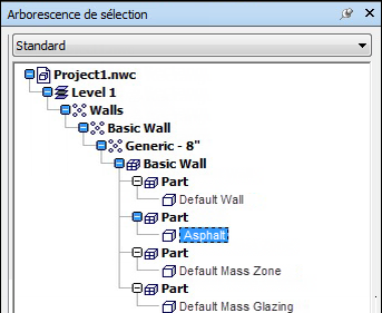 Vous pouvez configurer les paramètres de conversion des fichiers Revit afin de modifier l'affichage des fichiers dans l'arborescence de sélection. Par exemple, vous pouvez diviser le fichier en niveaux pour organiser la hiérarchie du modèle en commençant par Fichier dans la partie supérieure jusqu'à Catégorie, Famille, Type et Occurrence. Reportez-vous à la rubrique Diviser les fichiers Revit en niveaux. De même, pour des fichiers Revit, les sous-parties sont nommées en fonction de la matière dont elles sont composées. Par exemple, un mur peut être divisé en sous-parties composées d'asphalte ou d'aluminium.
