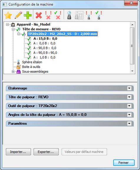 Pour afficher et gérer des fichiers la base de données de palpeur et afficher les détails de l'étalonnage pour une MMT, cliquez sur l'onglet Outils > Machines > Palpeurs. Les détails du palpeur utilisé et de ses étalonnages actuels sont affichés dans la boîte de dialogue Configuration de la machine.