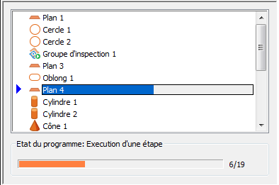 La zone de progression liste tous les éléments mesurables de la séquence d'inspection. Lorsque vous simulez la séquence d'inspection ou que vous exécutez la séquence sur une machine CNC, la zone affiche l'élément mesuré, le mouvement actuel, ainsi que le nombre total de déplacements dans le parcours de palpeur de l'élément. De plus, la barre Etat du programme au bas de la zone indique la position de l'élément actuel dans la séquence ; le nombre d'éléments de la séquence, et si la séquence est arrêtée (Inactive), s'exécute automatiquement (Tout exécuter), ou exécute un élément ou un mouvement à la fois (Exécution d'un pas). Par exemple :
