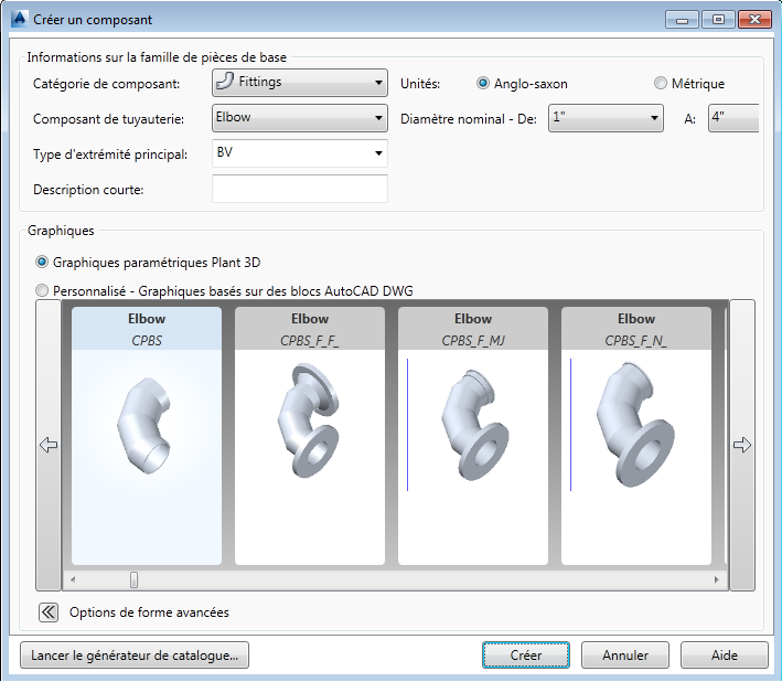 Les graphiques et le composant de tuyauterie ne peuvent pas être modifiés après la création du composant en question. Vous pouvez modifier les propriétés supplméentaires dans l'onglet Editeur de catalogues après la création du composant.