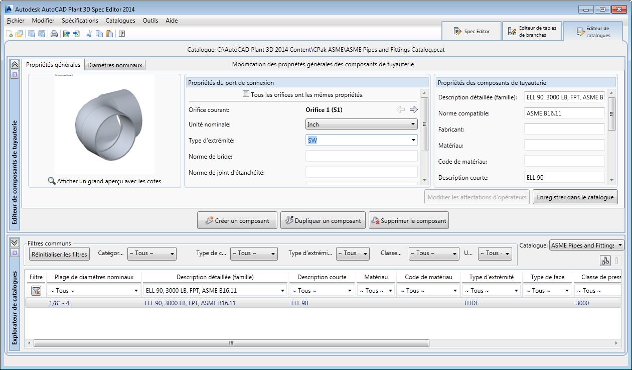 Modifie le contenu du catalogue de manière à personnaliser les informations sur les pièces. Vous pouvez ajouter et supprimer des pièces dans un catalogue. Vous pouvez modifier les propriétés des pièces, y compris les cotes à utiliser dans la modélisation AutoCAD Plant 3D toolset.