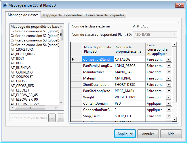 Spécifie les propriétés Plant 3D à mapper avec les propriétés tierces pour la classe sélectionnée dans le volet gauche.