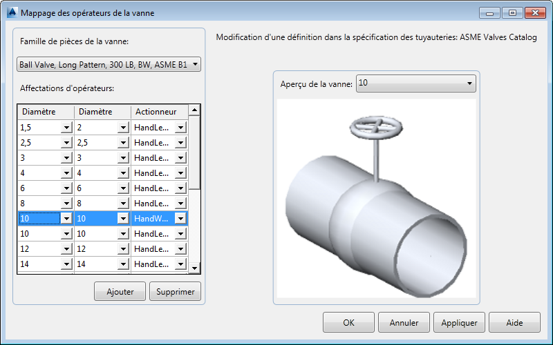 Définit l'actionneur par défaut à utiliser pour la plage de diamètres nominaux considérée.
