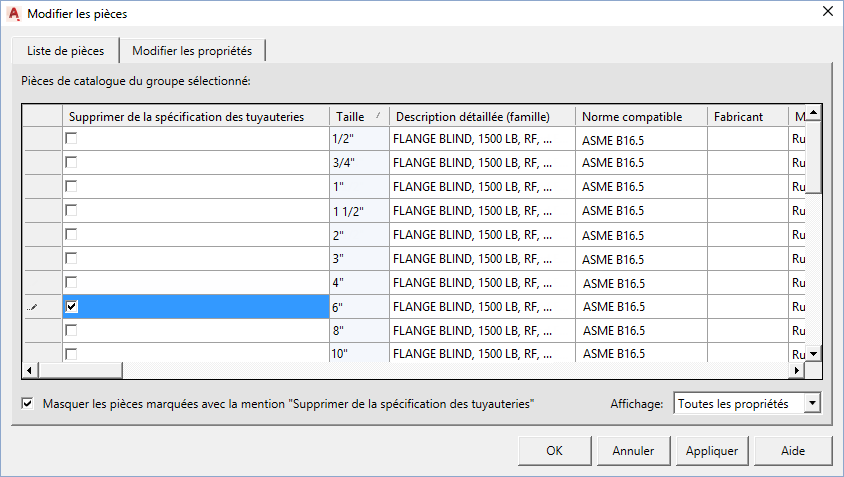 Si le diamètre nominal à ajouter n'apparaît pas lorsque vous désélectionnez Masquer les pièces marquées avec la mention "Supprimer de la spécification des tuyauteries", vous pouvez utiliser l'éditeur de catalogue pour ajouter le diamètre nominal.