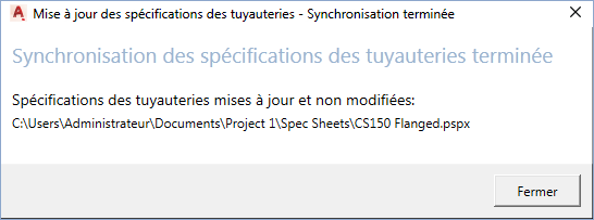 Remarque : Pour synchroniser les spécifications avec les catalogues, le fichier de spécification doit être fermé et un accès exclusif à ce fichier est requis.