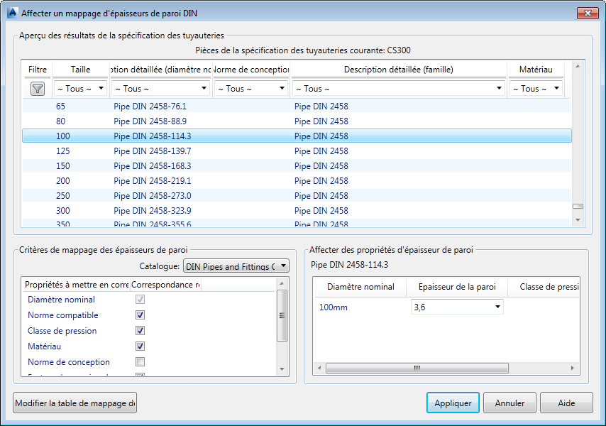 Affiche la boîte de dialogue Modifier la table de mappage des épaisseurs de paroi DIN. L'épaisseur de paroi est enregistrée avec le catalogue.