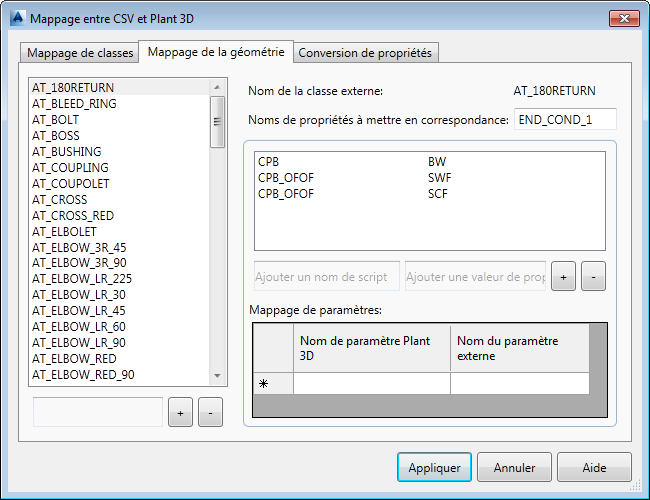 Définit le mappage des paramètres entre Plant 3D et le programme tiers. A chaque mappage de géométrie correspond un jeu de paramètres, qui peuvent varier en fonction de la forme.