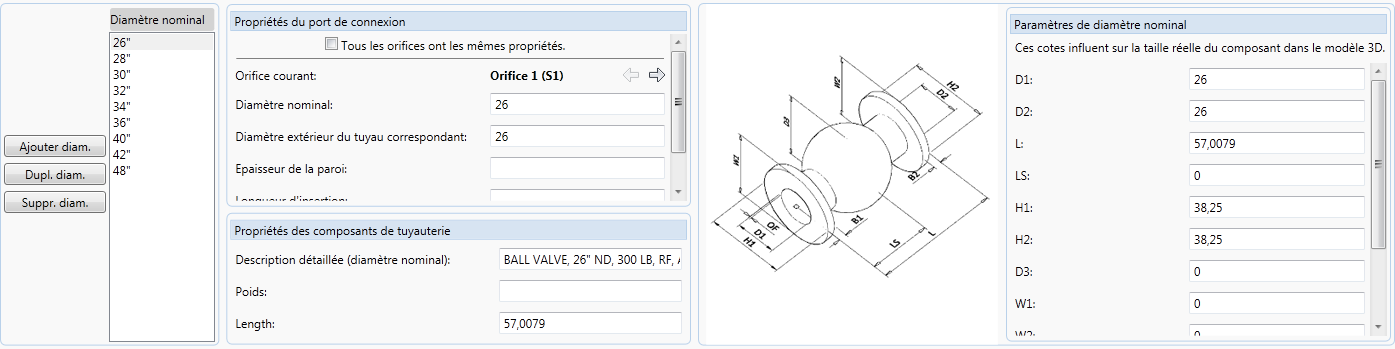 Copie les propriétés et les cotes du diamètre nominal sélectionné dans la liste Diamètre nominal. Le nouveau diamètre nominal est intitulé non défini jusqu'à ce qu'un diamètre nominal unique lui soit affecté.