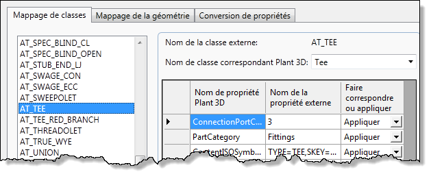 Des propriétés globales telles que la description détaillée, la classe de pression, le schedule, etc. , peuvent être mappées globalement pour toutes les classes. Les propriétés de classe individuelles, à l'inverse, sont mappées une à une avec les propriétés de classe Plant 3D correspondantes.