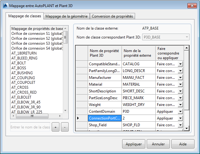 Les mappages de classes individuelles sont prioritaires sur les mappages globaux. Dans la boîte de dialogue Mappage entre AutoPLANT et Plant 3D, p. ex. le mappage global pour ConnectionPortCount est 2.