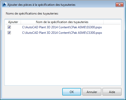 Définit les fichiers de spécification des tuyauteries où ajouter les pièces de catalogue. Un fichier de spécification des tuyauteries doit être ouvert pour apparaître dans la liste.