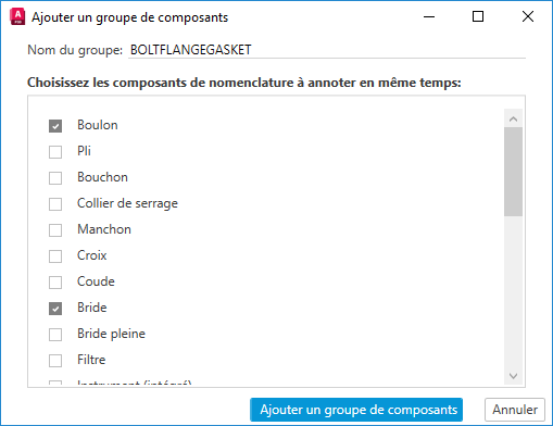 - Dans l’annotation ID de nomenclature (composants), vous pouvez personnaliser le groupe de composants et effectuer les opérations suivantes :